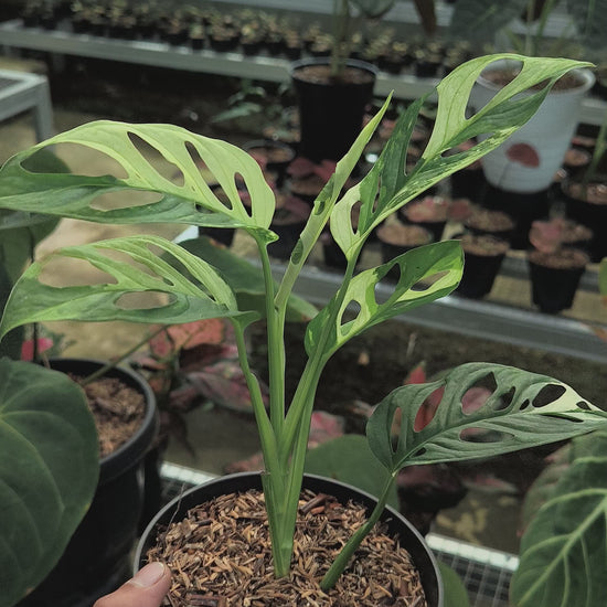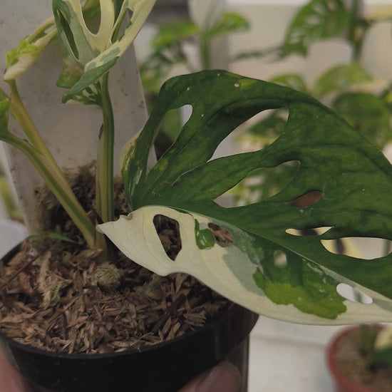 Monstera adansonii ‘Albo Variegata’ is a climbing Monstera with distinctive leaf holes (fenestrations) splashed in white-to-cream variegation—ranging from marbling to bold sectors. Keep in bright, filtered light (pale tissue sun-sensitive), water when the top 2–3 cm dries, and maintain 60–80% humidity at 18–30 °C. Use a chunky, fast-draining aroid mix and provide a trellis/moss pole for larger, well-spaced leaves. Intermediate care; high-white leaves grow slower. Securely packed for shipping (typically bare-root in moist sphagnum).
