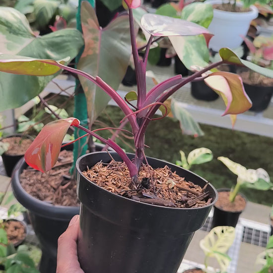 Philodendron erubescens ‘Pink Princess’ is a climbing aroid with dark, glossy leaves streaked and sectorally splashed in bright pink. Keep in bright, filtered light to maintain color (avoid harsh midday sun), water when the top 2–3 cm of mix dries, and aim for 60–80% humidity at 18–30 °C. Grow in a chunky aroid mix and provide a moss pole for larger leaves. Easy–intermediate care; occasional green reversion is normal. Securely packed for shipping (typically bare-root in moist sphagnum).