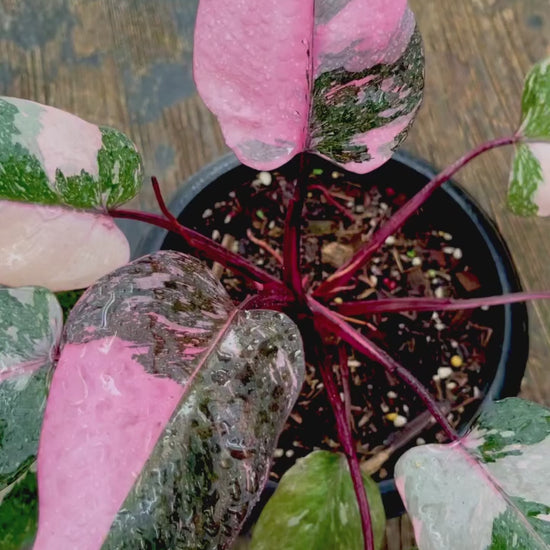hilodendron erubescens ‘Pink Princess’ Galaxy is a climbing aroid prized for its dark, nearly black leaves flecked and splashed with bright pink “galaxy” speckles. Give bright, filtered light to keep color strong, water when the top 2–3 cm of mix dries, and maintain 60–80% humidity. Grow in a chunky aroid mix and train on a pole to encourage larger leaves. Intermediate care; occasional reversion is normal. Securely packed for shipping (typically bare-root in moist sphagnum).