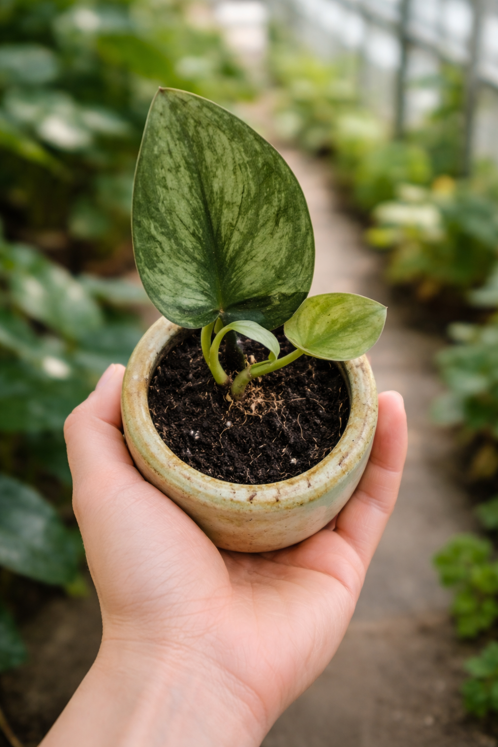 Scindapsus Hologram — Scindapsus Hologram is a trailing vine with satin-like leaves mottled in silver and green. Provide bright, filtered light to maintain healthy growth, water when the top 2–4 cm of the potting mix dries, and maintain humidity around 60–80%. Use a chunky, well-draining aroid mix and ensure good airflow around the roots. This plant can climb or trail; consider a pole or trellis to encourage larger leaves. Intermediate care. Securely packed for shipping (typically bare-root in moist sphagnum).
