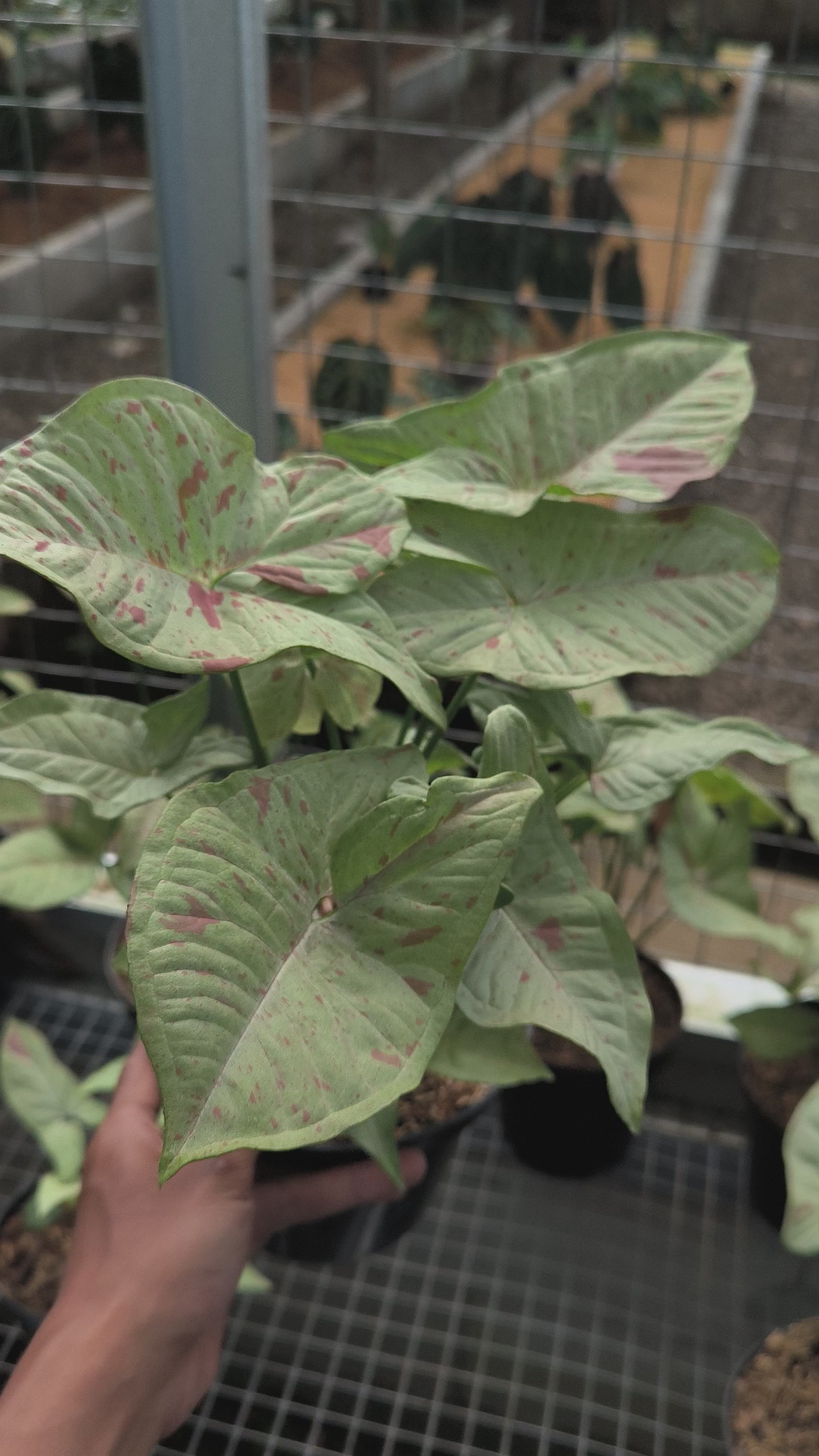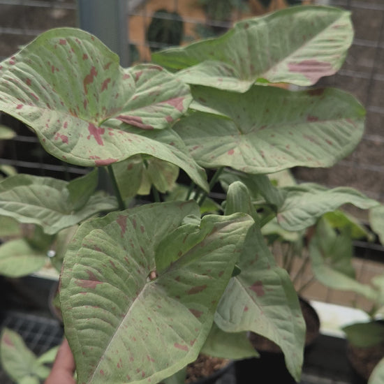 Syngonium ‘Milk Confetti’ is a compact, vining arrowhead with green leaves splashed in creamy “milk” variegation and dotted with soft pink confetti speckles. Thrives in bright, filtered light (tolerates medium; low light reduces color). Water when the top 2–3 cm dries and keep 50–70% humidity at 18–30 °C. Use a well-draining aroid mix and provide a small pole or let it trail. Easy care and great for shelves or hanging baskets. Securely packed for shipping (typically bare-root in moist sphagnum).